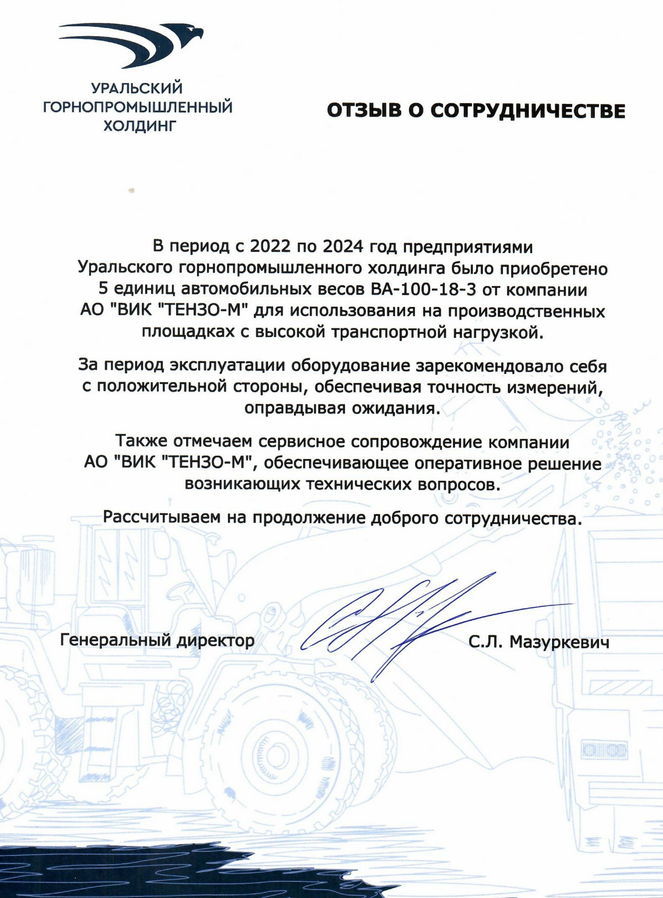 Выражаем благодарность за долговременное плодотворное сотрудничество. За время совместной работы нами были приобретены несколько платформенных и автомобильных весов. Все они оправдали наши ожидания, работают исправно, без нареканий