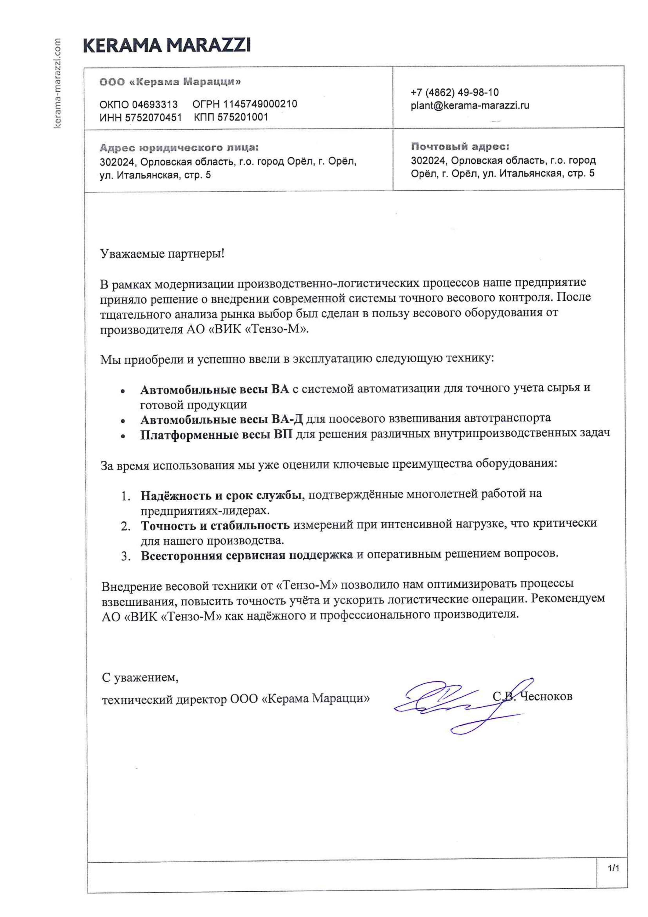 Внедрение весовой техники от «Тензо-М» позволило нам оптимизировать процессы взвешивания, повысить точность учёта и ускорить логистические операции. Рекомендуем АО «ВИК «Тензо-М» как надёжного и профессионального производителя.