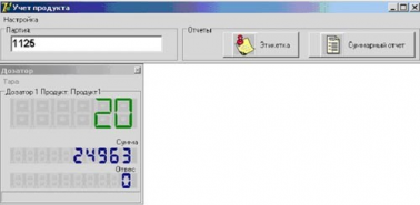 Во время работы программа с большой скоростью опрашивает сконфигурированные в настройках дозаторы. На экран выводится вес, значения счетчика последнего отвеса и счетчика суммы. Обновление счетчиков происходит после произведенного дозатором отвеса. Программа отслеживает факт изменения, определяет величину отвеса и, дополнив информацию данными о продукте, партии и времени отвеса, записывает полученную информацию в базу данных.