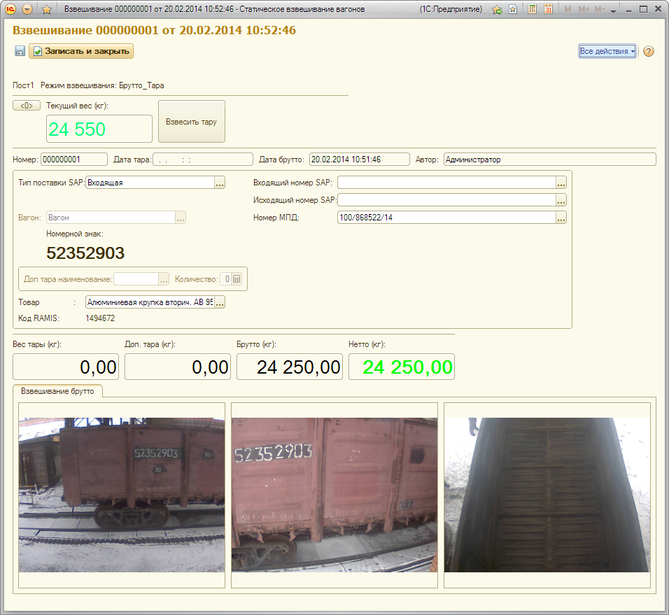 Статическое взвешивание вагонов для 1С 8.2